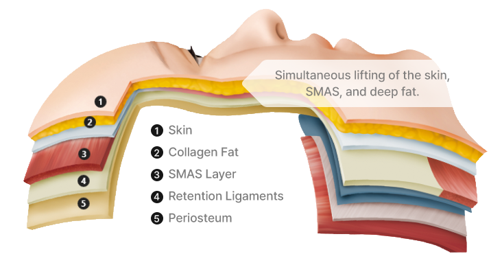 Simultaneously lifts the skin, SMAS, and deep fat layers,