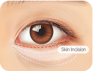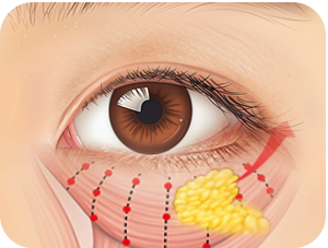 Incision below the eyes and dissection of the orbicularis oculi and under-eye fat pockets