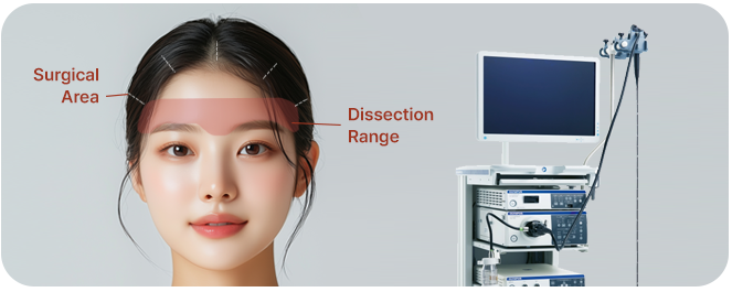 At LABOM, we perform the surgery through endoscopy, allowing us to view directly and lift the eyelid area widely while securely cutting the retention ligaments for a clear forehead lift. Unlike the use of Endotine, which can cause pain and discomfort, we use our unique techniques to secure the area without these side effects.