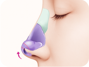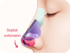 The cartilage at the nasal tip is trimmed, and septal extension surgery is performed to move the nasal cartilage upward and secure it, lifting the drooping nose tip.