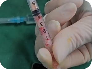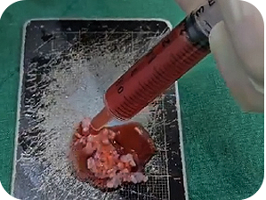 Instead of only injecting autologous cartilage, we also inject fibrin concentrate separated from the patient’s blood. This fibrin concentrate increases the viscosity to prevent the cartilage particles from dispersing and contains growth factors that enhance cartilage survival, improving the success rate of autologous cartilage grafts.